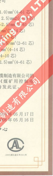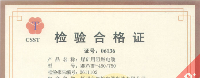 國家采煤機械質(zhì)量監(jiān)督檢驗中心檢驗合格證--煤礦用阻燃電纜(MKVVRP-450/750)
