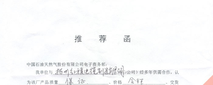 吉化股份有限公司向中國石化天然氣有限公司電子商務(wù)部推薦我公司和產(chǎn)品的推薦函