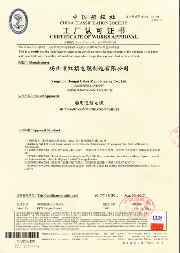 中國船級社工廠認可證書(船用通信電纜)