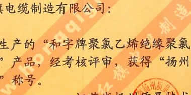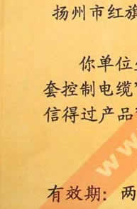 揚(yáng)州市質(zhì)量信得過產(chǎn)品稱號(hào)證書(和字牌聚氯乙烯絕緣聚氯乙烯護(hù)套控制電纜)