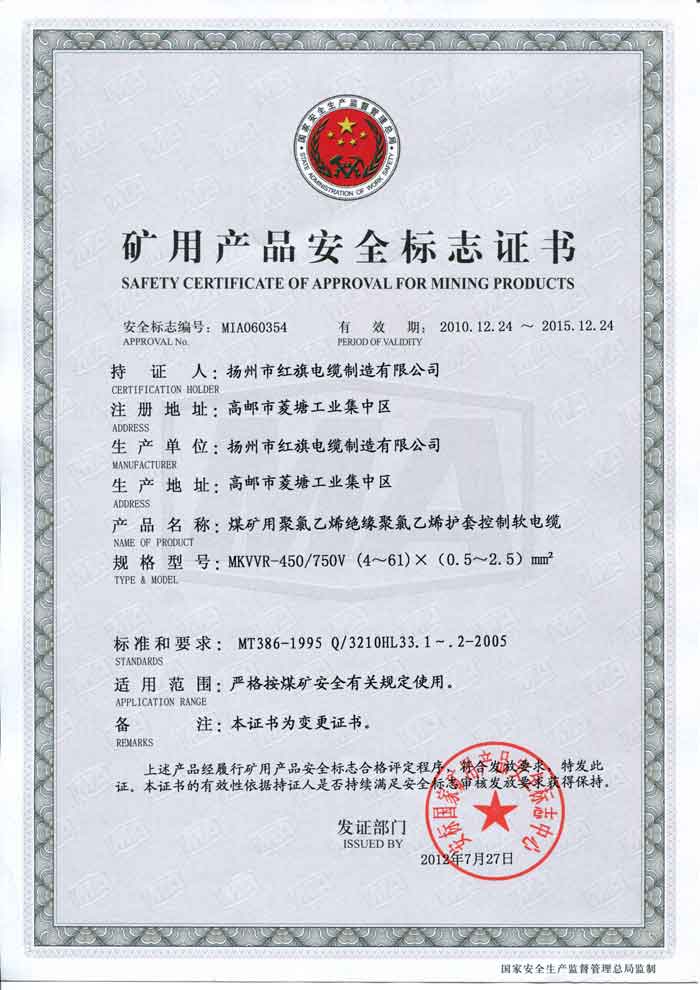 煤礦礦用產(chǎn)品安全標(biāo)志證書-MKVVR