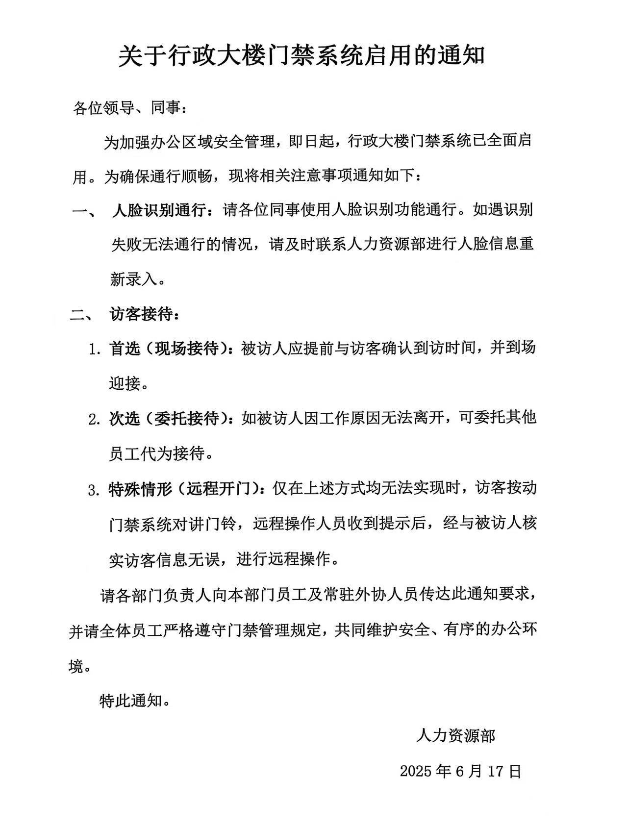 關(guān)于行政大樓門禁系統(tǒng)啟用的通知